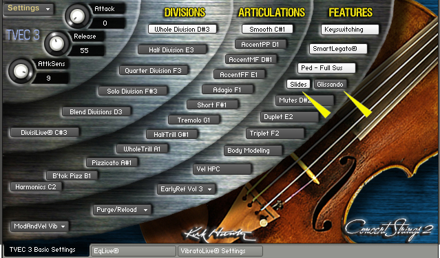 | SlidesLive® gives you the ability to slide or "gliss" from one note to another. Currently, this feature is designed to be accessed via the pitch wheel. We could have made SlidesLive® respond automatically without the use of a controller. But to us, it seemed that this would cause limits. Typically, most other sliding features work when you play notes that overlap. But what if you want to engage this feature when not overlapping the notes? Or what if you don't want to engage the feature when you do overlap? Clearly it seemed that an engage/disengage function should be implemented. That's why we chose to use the pitch wheel. Therefore, raising the pitch wheel when playing ascending lines, and lowering the pitch wheel when playing descending lines gives you the SlidesLive® feature.