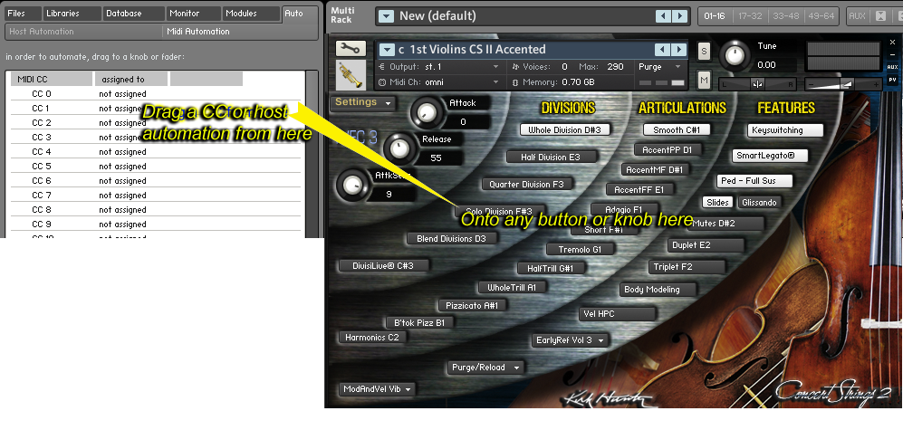 All you have to do is open Kontakt's Automation Pane, and drag a CC or Host Automation to any knob or button on the TVEC 3 Interface.