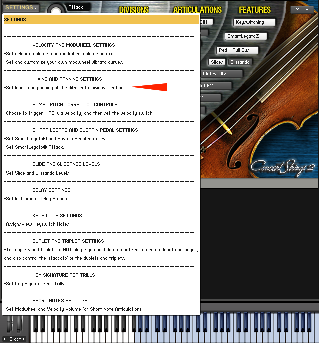 | Some instruments have as many as four Divisions, namely,"Whole", "Half", "Quarter" and "Solo". These instruments are called "Quads". You can choose to blend these divisions, and then mix and pan them to your taste. Choose the SETTINGS dropdown menu, and then choose "Set level and panning of the different divisions". Make sure you have selected "Blend Divisions" from the Divisions Rim.