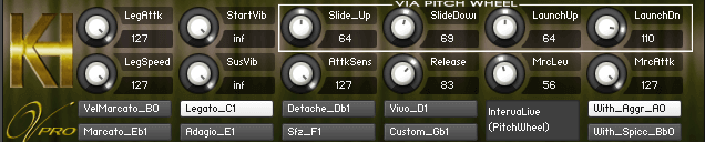IntervaLive® – this is used for legato notes. Raising or lowering the pitch wheel (TVEC2) triggers manufactured release samples that bend up or down to lead into the target note. Used full-bore, the effect is almost portamento; used more subtly it just adds a realistic transition between two notes. The farther you move the pitch wheel, the louder the transition effect. You can also dial the amount of bend up or down using on-screen controls.