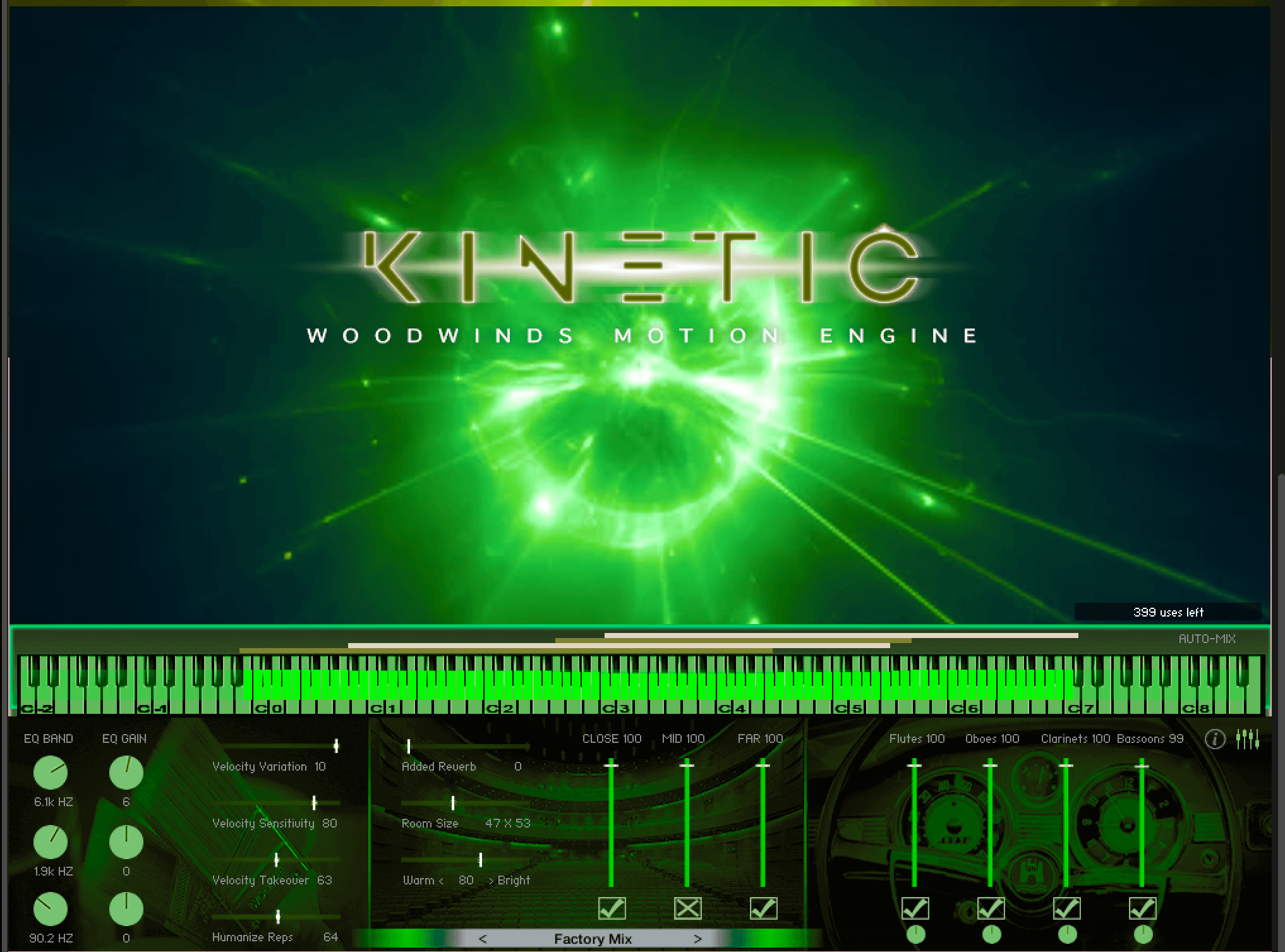 At the time of this publication, there does not exist another instrument that can let you play FOUR short-sample Woodwinds sections (flutes, oboes, clarinets and bassoons) at the SAME TIME. But wit Kinetic, you get the entire Woodwinds section in one instrument. That means you get a separate timeline for each section. Each timeline contains 64 note or rest events and can be divided into up to 4 "regions". And you can have each timeline play a different pattern whether you hold down a single note or chord!