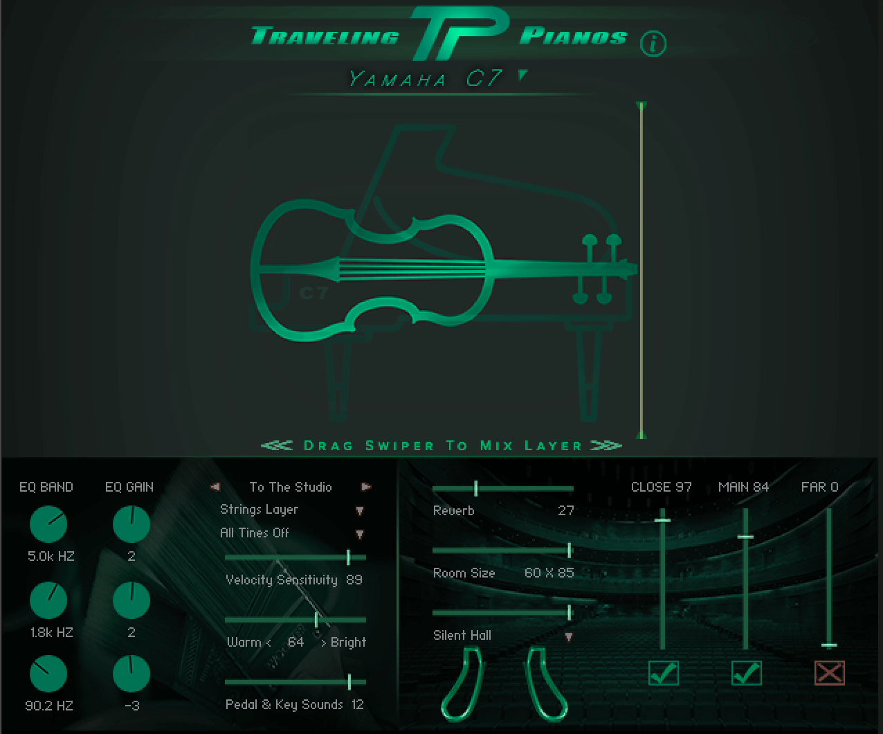 Thirdly, we have created over 20 creative built-in presets. And you can customize and change any of these presets via EQ, 3 Mic positions, reverb amount, room size, added tines, string and saloon (honky tonk) layers.